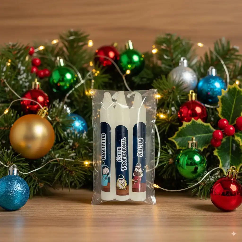 Cada bolsita incluye 2, 3 o 4 velitas de 12 cm de alto, marcadas con palabras cargadas de significado como gratitud, éxito, salud, prosperidad, familia o armonía. Esto convierte a cada vela en un símbolo, transformando la tradición de encender luces en un ritual lleno de magia y propósito.