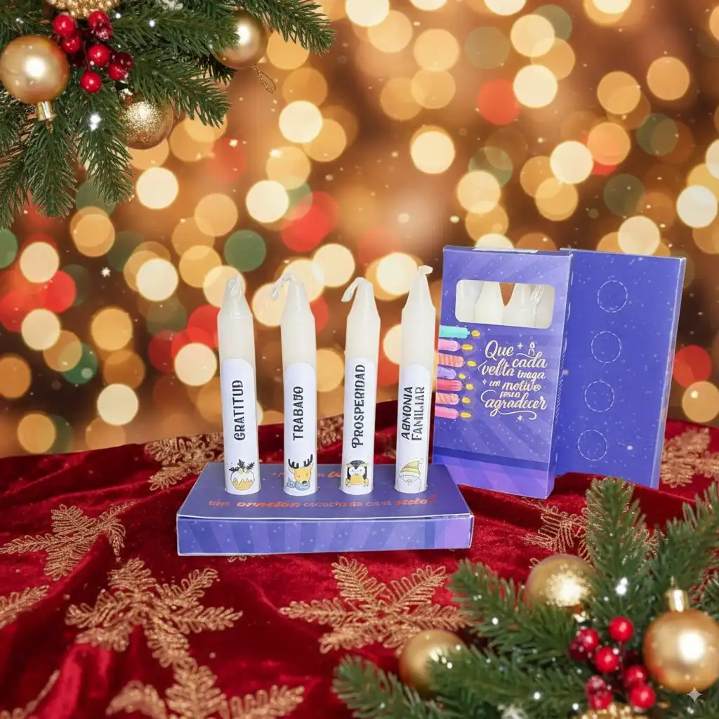 Cada set incluye 4 velas de 12 cm de alto, presentadas en una hermosa caja impresa que no solo protege, sino que también funciona como base para colocarlas. Lo más especial de este producto es que cada vela lleva un deseo impreso: gratitud, trabajo, prosperidad y armonía, haciendo que cada llama encendida sea un recordatorio de lo que realmente importa en la vida.